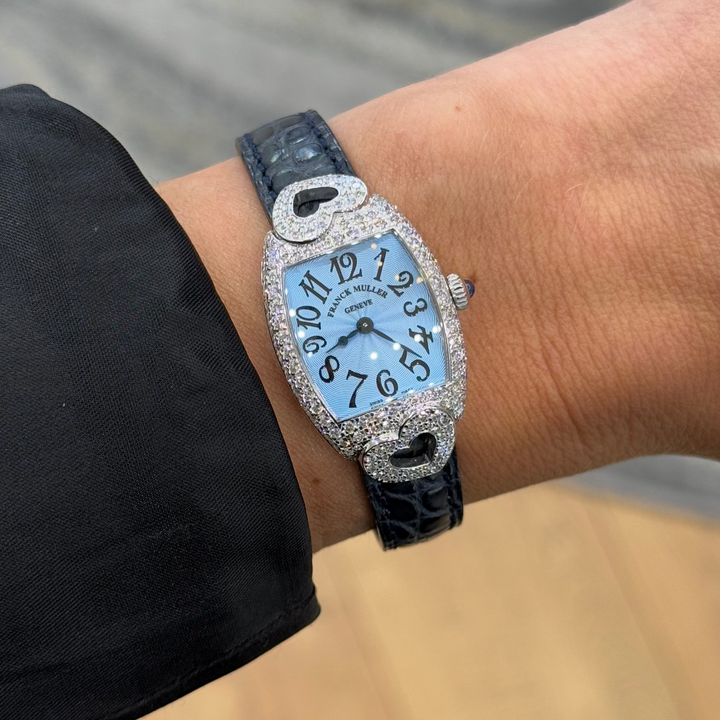 An elegant and luxurious ladies Franck Muller Coeur diamond dress wristwatch. This gorgeous timepiece is crafted in solid 18k white gold and studded with brilliant cut round diamonds. Its stunning diamond 18K white gold case and the original navy blue leather band are both in excellent condition. Buckle 18K white gold with diamonds. The beautiful case pairs perfectly with its Franck Muller guilloche light blue dial. The beautiful dial is set with blue hands and arabic hour markers in black enamel. The dial is signed Franck Muller Geneve underneath 12 o'clock. Its sapphire crystal is in excellent condition with no visible scratches. Its case back is marked Franck Muller Geneve No.88 2250 QZ HJ Coeur. This watch has a quartz movement. Its case measures 38.2mm from lug to lug, 22mm diameter excluding the crown, and 8.3mm thick. This watch has been verified authentic by a master watchmaker, serviced, timed, and comes with a two year warranty. Diamonds weigh 1.75 carat total weight, VS clarity, and FG color.