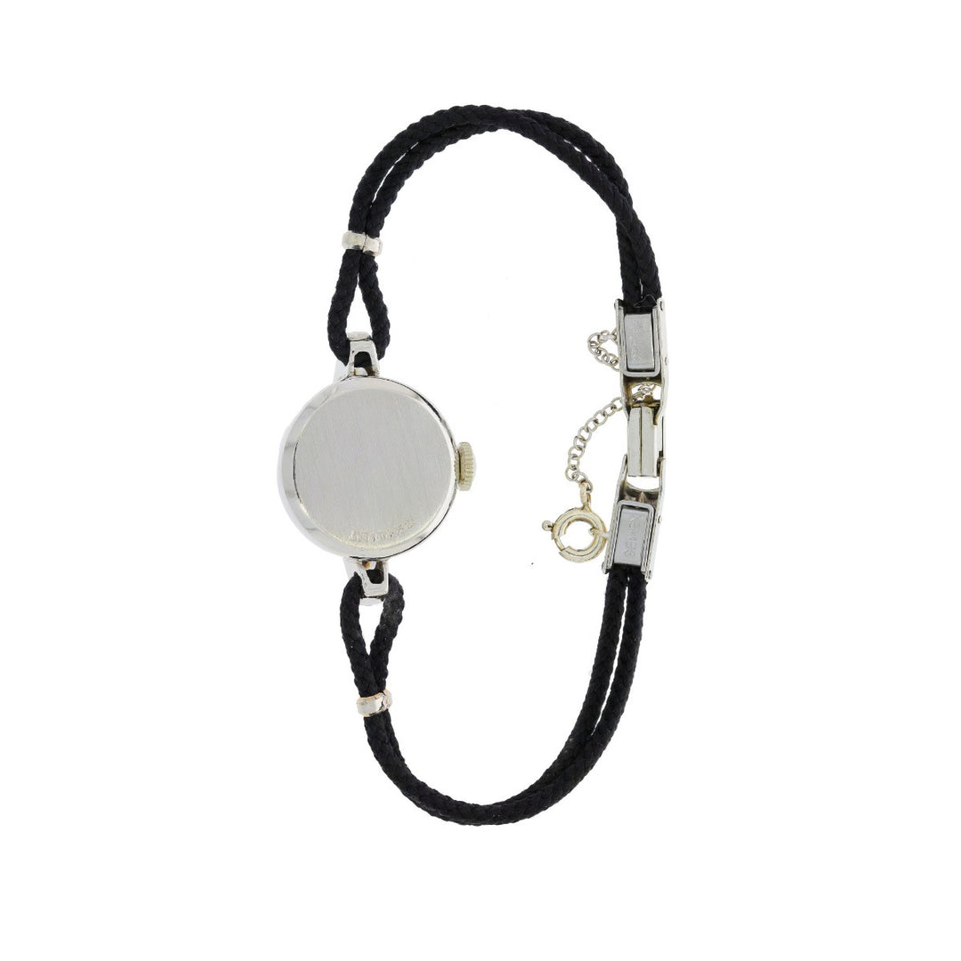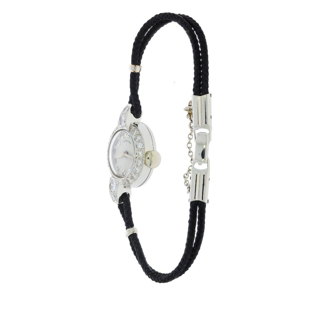 An elegant and luxurious ladies Hamilton cocktail diamond wristwatch. This gorgeous timepiece is crafted in platinum with round diamonds and dates from around the 1940s. Its stunning diamond case and black cord band are both in excellent condition. The beautiful case pairs perfectly with its Hamilton creamy dial. The dial shows a small amount of patina which only contributes to the beauty and character of this stunning timepiece. The beautiful dial is set with silver tone hands and Arabic hour markers. Its crystal is in excellent condition with no visible scratches. A silver-tone manual wind and set crown is in great condition. Mechanical hand-wind 22 jewel caliber 757 movement. Made in USA. Case back is marked PLAT. Its case measures 27.5mm from lug to lug, 18mm diameter excluding the crown, and 7.5mm thick. A black cord band with a steel clasp and safety chain compliments the watch. This watch fits wrist size up to 6.50-inches. This watch has been verified authentic by a master watchmaker, serviced, timed, and comes with a one-year warranty. Diamonds weigh 0.95 carat total weight, VS clarity GHI color.