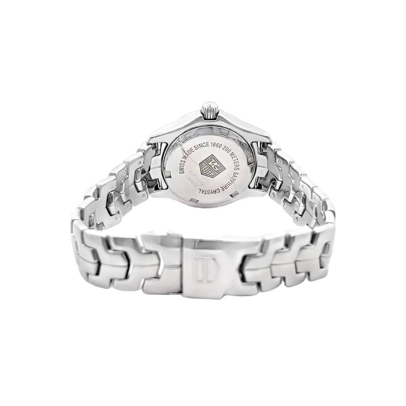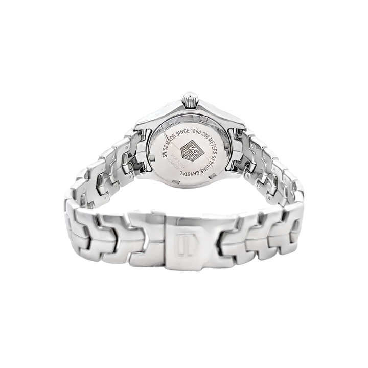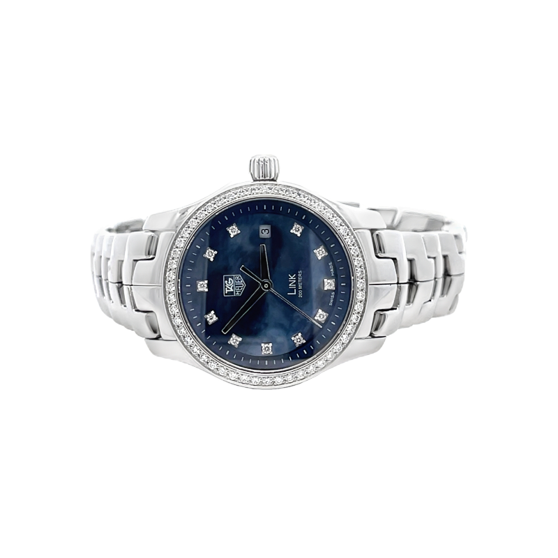 Luxurious ladies Tag Heuer professional wristwatch. Features a striking stainless steel case and band with an alluring mother of pearl dial accompanied by diamond markers and silver toned hands and seconds hand. This timepiece also features a date window at three o'clock and a diamond bezel. This watch has a scratch resistant sapphire crystal. Its beautiful dial is signed Tag Heuer underneath 12 o'clock, LINK 200 meters above 6 o'clock, and Swiss Made underneath the 6 hour marker. This watch has a quartz movement, and comes with an original screw-down crown. The case back is signed SWISS MADE SINCE 1860, SAPPHIRE CRYSTAL, 200 METERS, WJF131G, CA0678. Original Tag Heuer stainless steel link band compliments this watch. This watch has a fresh new battery and comes with a one-year warranty.