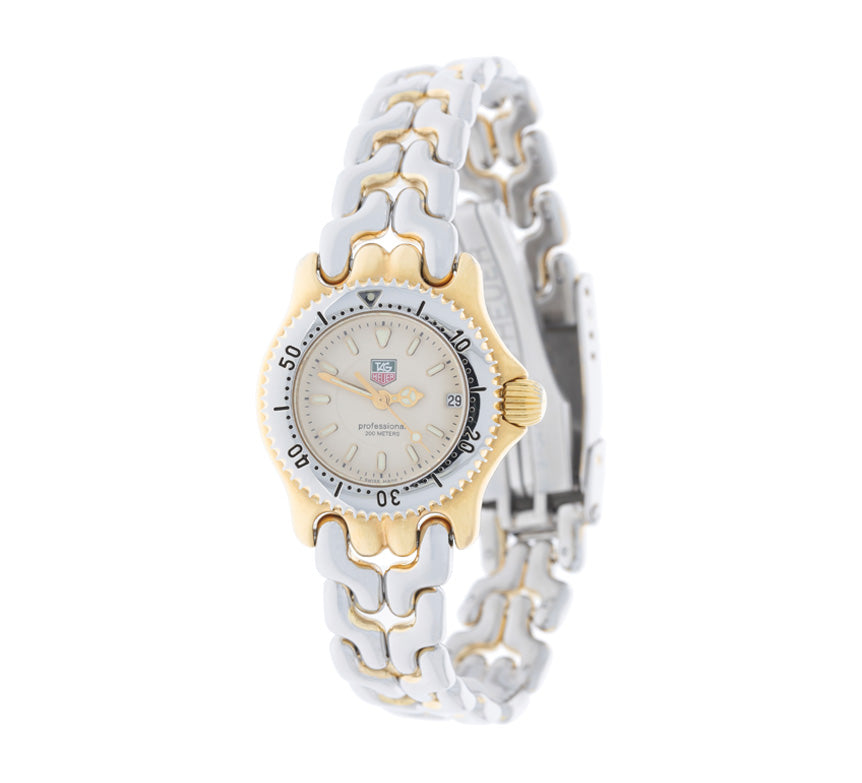Luxurious and classic ladies Tag Heuer wristwatch. Features a striking yellow tone stainless steel case and stainless steel band with an alluring cream tone dial accompanied by lume filled yellow toned hands and lume filled hour index markers.  The case and band do show some wear. This timepiece also features a date window at three o'clock and a uni directional rotating steel bezel. This watch has a scratch-resistant sapphire crystal. Its beautiful dial is signed Tag Heuer underneath 12 o'clock, professional 200 meters above 6 o'clock, and Swiss Made underneath the 6-hour marker. Tag Heuer screw-down crown. This watch has a quartz movement, serial # WG1430-0. The case back is signed STAINLESS STEEL SAPPHIRE CRYSTAL SWISS MADE SINCE 1860 WATER RESISTANT 200 M TESTED, WG1430-0, RH2112. An original stainless steel link band compliments this watch. Its case measures 28mm lug to lug, 24.5mm diameter excluding the crown, and 8mm thick. Fits wrist size up to 6.50-inches. This watch has a fresh new battery and comes with a one-year warranty.