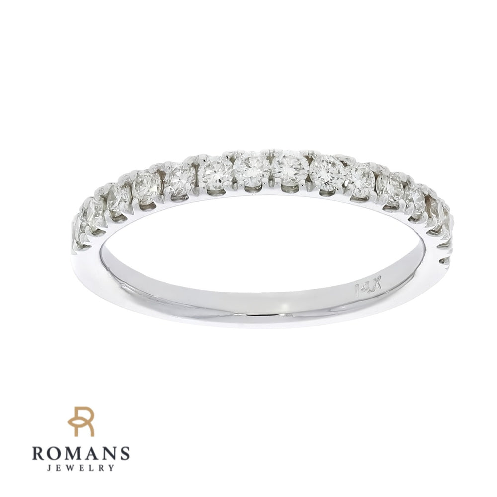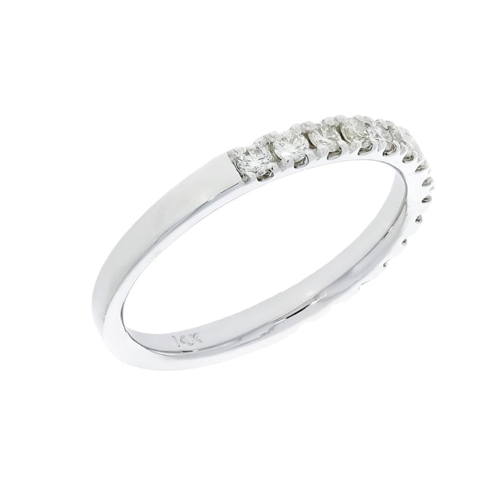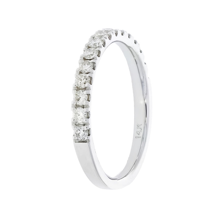 Crafted from 14k white gold, this diamond ring is a style essential. A row of sparkling round brilliant diamonds shimmer brightly half way down the shank. Perfect wedding band to match any engagement ring.