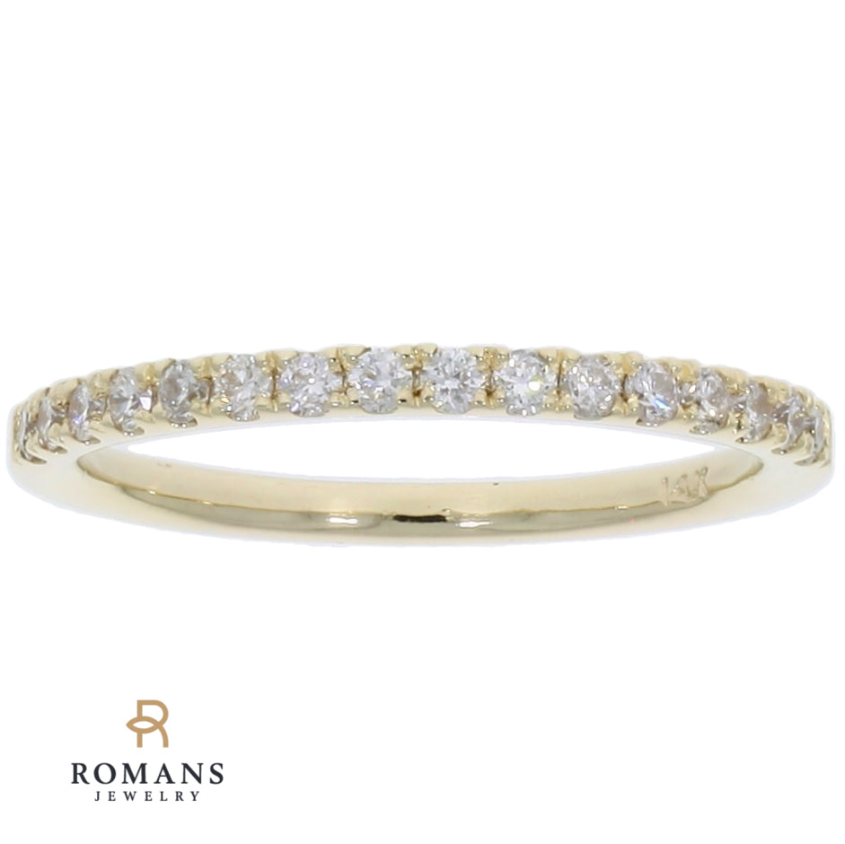 Crafted from 14k yellow gold, this diamond ring is a style essential. A row of sparkling round brilliant diamonds shimmers brightly half way down the shank. Perfect wedding band to match any engagement ring.