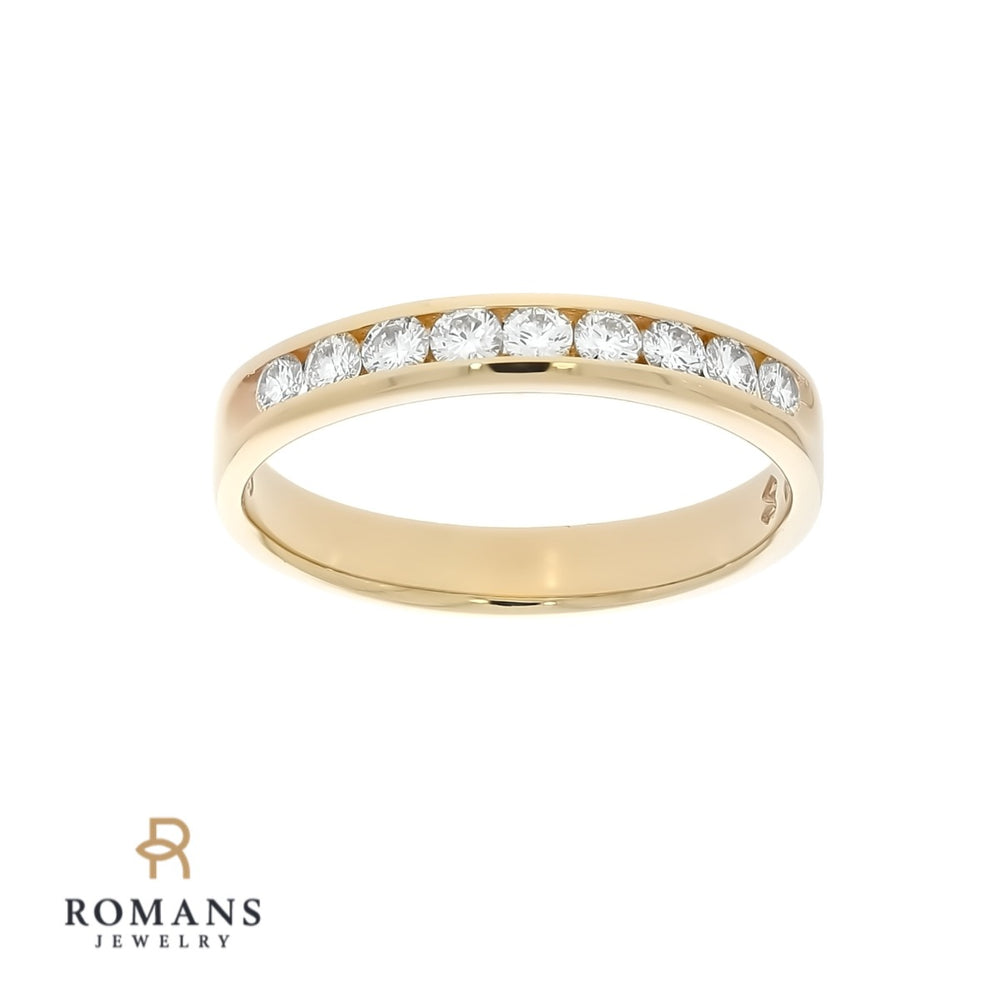 Enticing round dazzling diamonds adorn this channel set. The beaming white diamonds exude a stunning contrast and are set in 14k yellow gold.