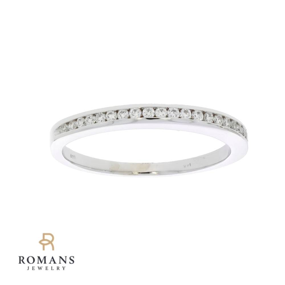 This stunning 14k white gold band features a row of round brilliant cut diamonds secured in a channel that extends halfway down the shank for eye-catching sparkle.