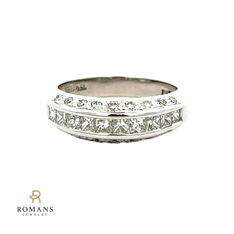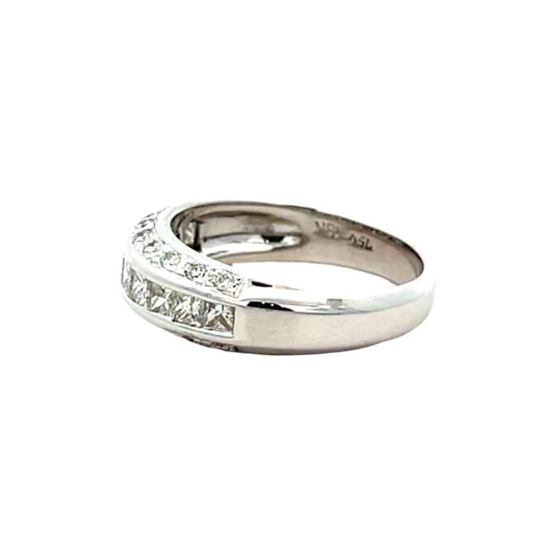 Crafted from 18k white gold, this diamond ring is a style essential. A row of sparkling princess cut diamonds shimmer brightly half way down the shank, with round diamonds bezel set along the sides. Perfect wedding band to match any engagement ring.