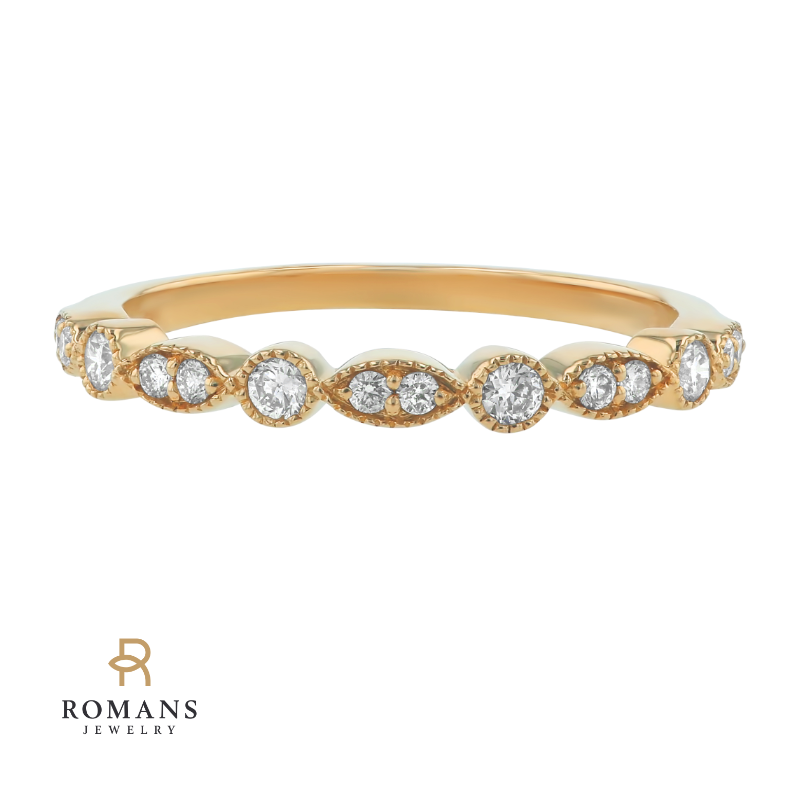Vintage-inspired, this diamond band is crafted in 14k yellow gold and features petite diamonds set in a marquise pattern with milgrain edges. Wear it on its own or add it with other textures and metals for a unique stack.
