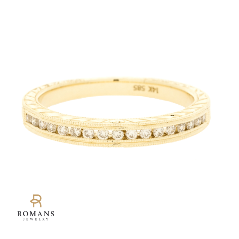 This 14k yellow gold vintage-inspired band with a channel set glittering row of bright diamonds with milgrain accents and engraving details.