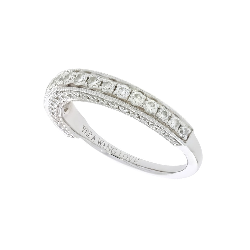 Crafted from 14k white gold, this diamond ring is a style essential. A row of sparkling round brilliant diamonds shimmer brightly half way down the shank and on the sides. Perfect wedding band to match any engagement ring.