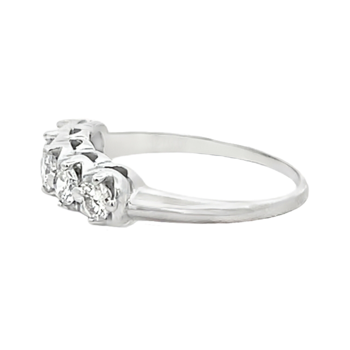 Crafted from 14k white gold, this diamond ring is a style essential. A row of five sparkling round brilliant diamonds shimmer brightly half way down the shank. Perfect wedding band to match any engagement ring.