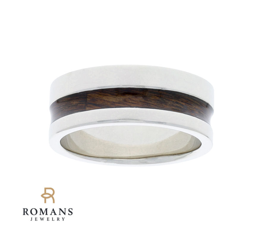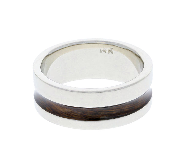The strong-grained pattern of the polished wood inlay is the striking feature of this flat-profiled polished 14K white gold ring.