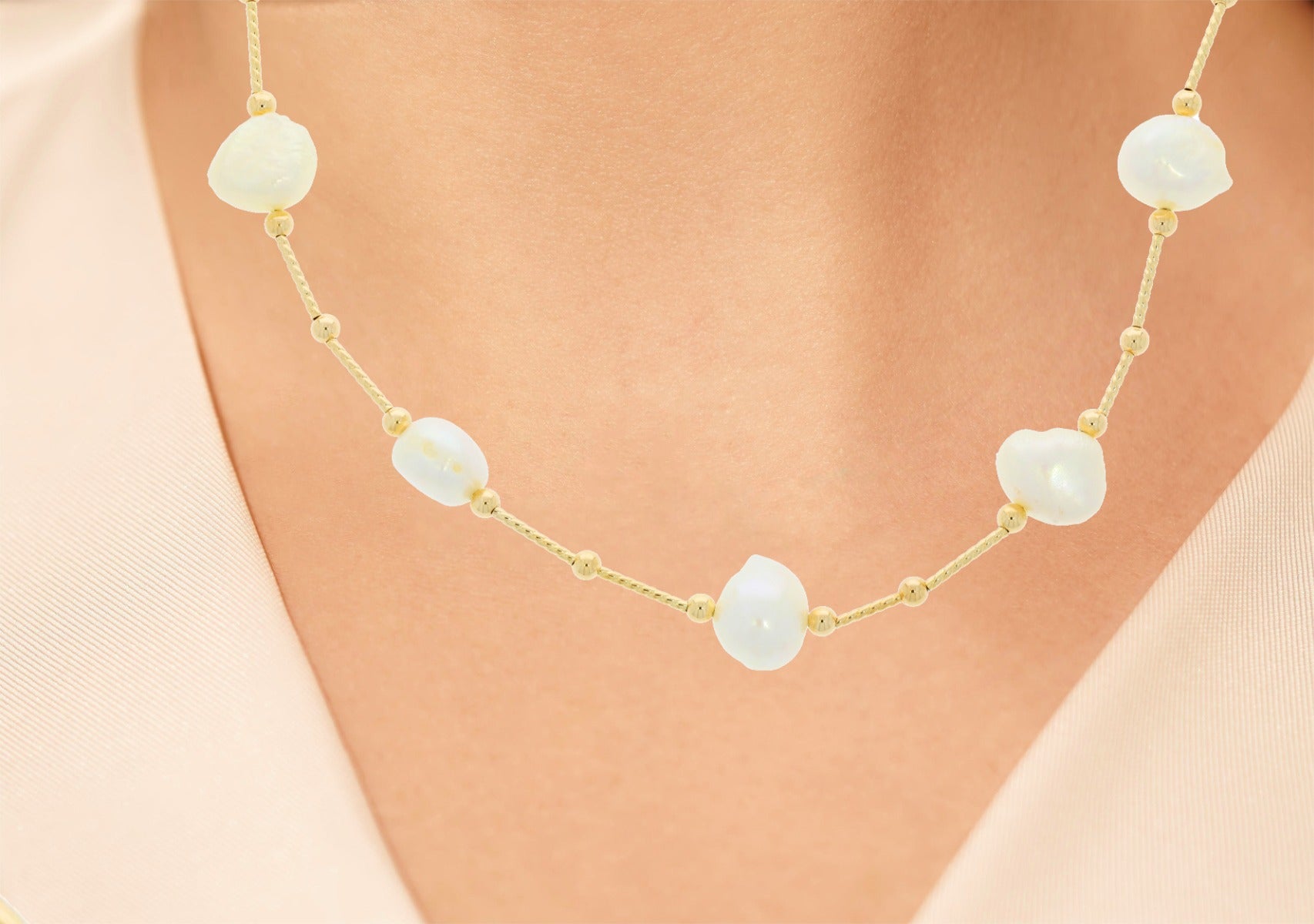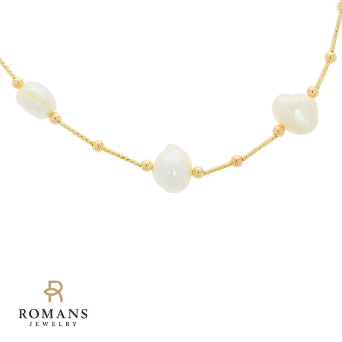 This stunning necklace features a beaded strand of high quality baroque pearls. These elegant organic pearls feature brilliant luster and shine with traditional grace and beauty and have 14K yellow gold beads in between the pearls for extra security with a 14k yellow gold clasp.