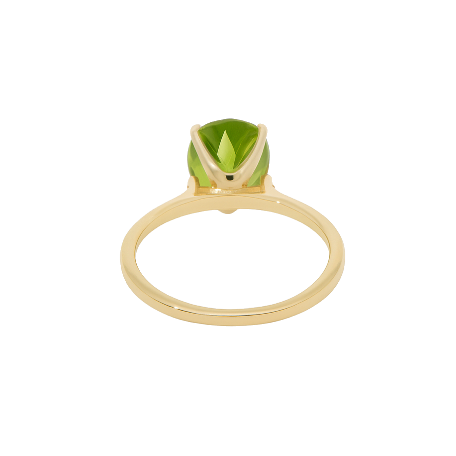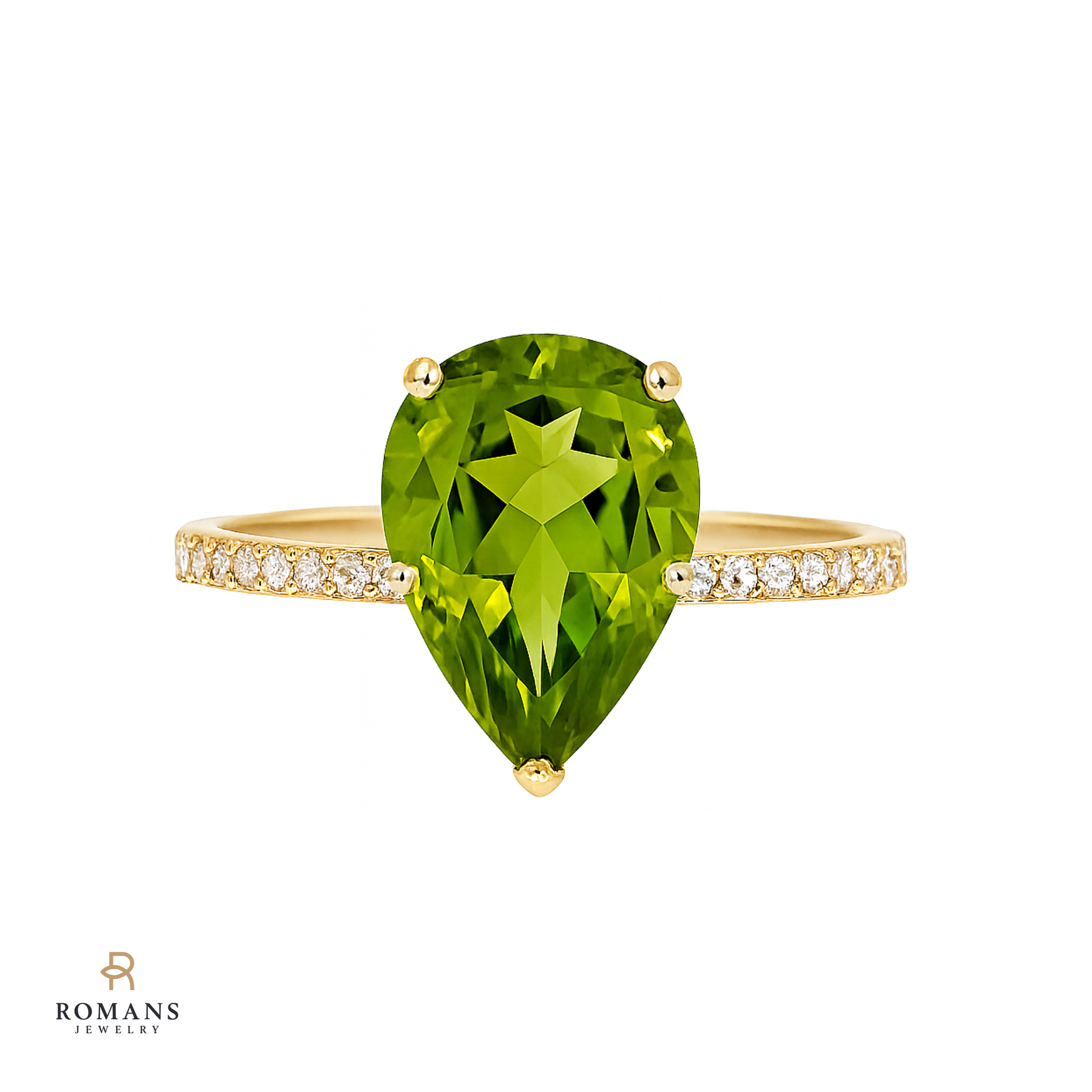 A breathtaking pear shape peridot stone nestles at the center of this luxurious ring, complemented by round diamonds on either side of the shank. The 14K yellow gold setting holds them gracefully in simple, sophisticated style.