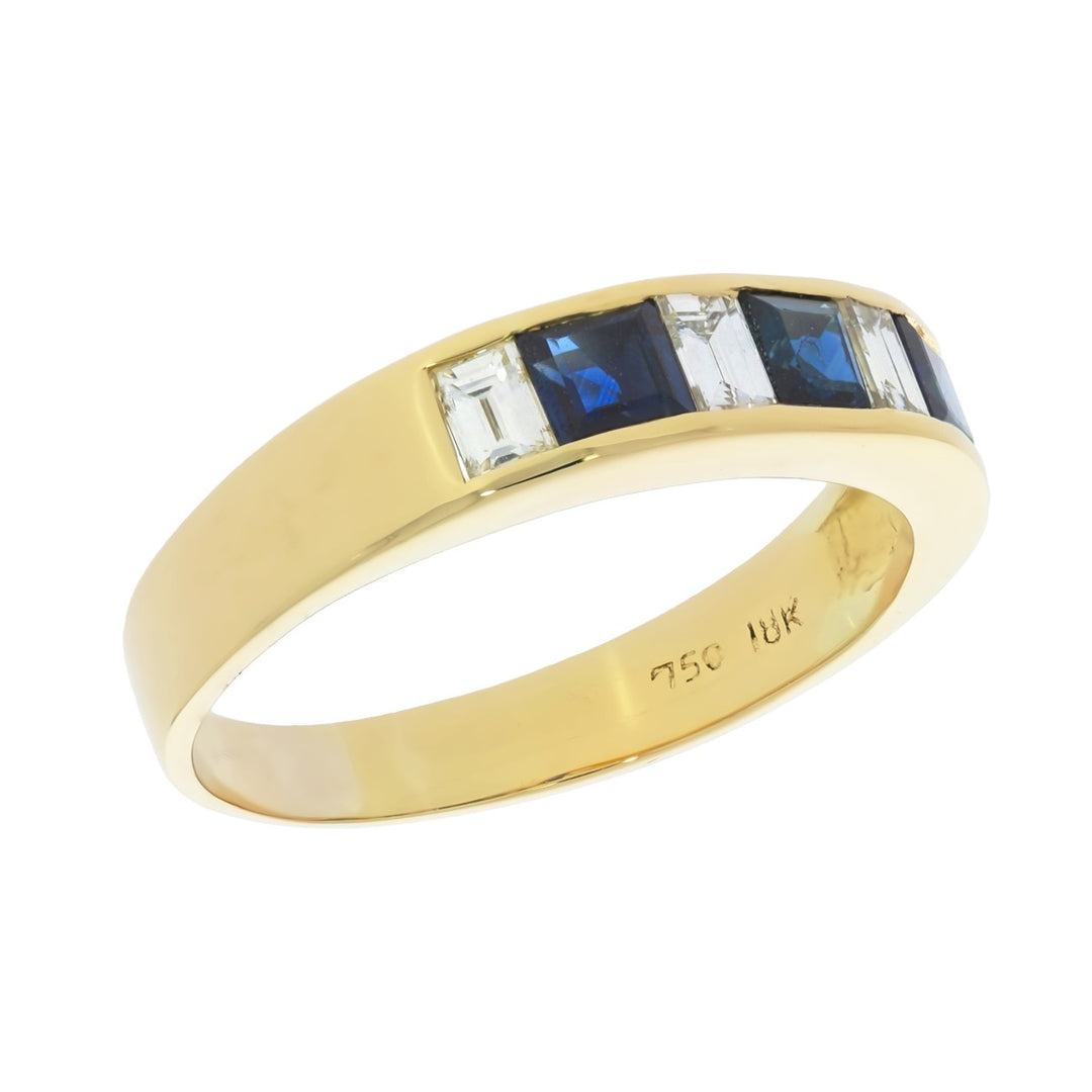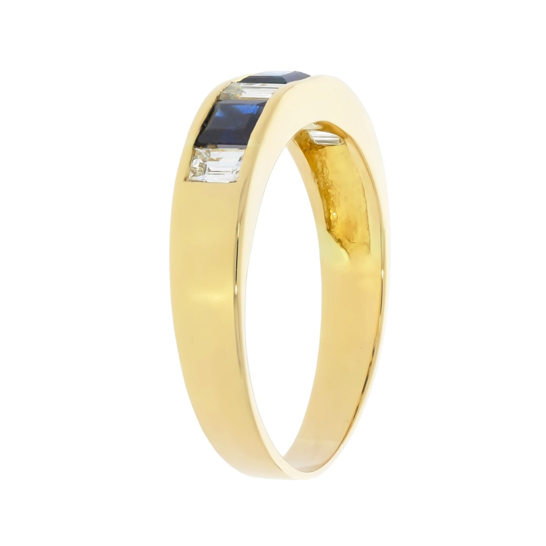 This stunning band features a row of baguette cut diamonds and princess cut blue sapphires secured in a channel that extends less then halfway down the shank for eye-catching sparkle.