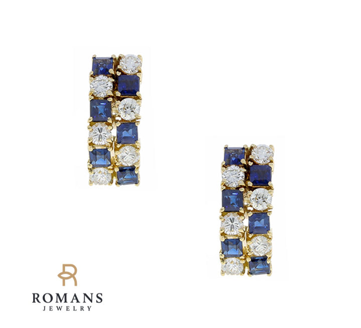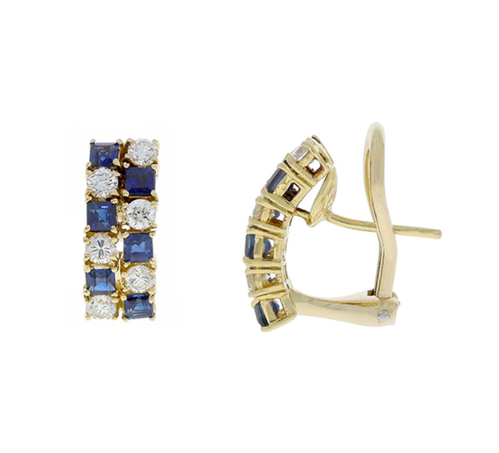 These delightful omega backs earrings feature enchanting princess cut blue sapphires and diamonds shimmer in a checkered pattern.