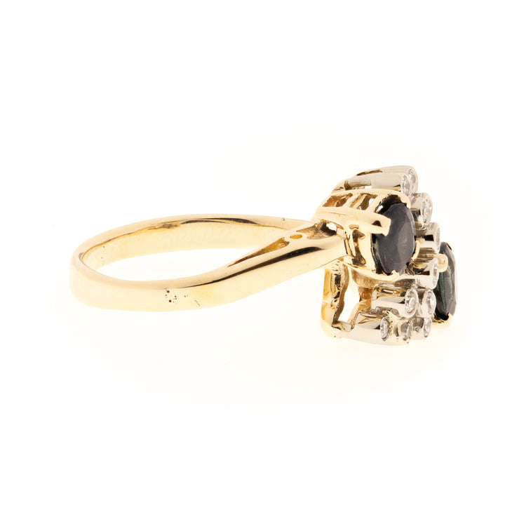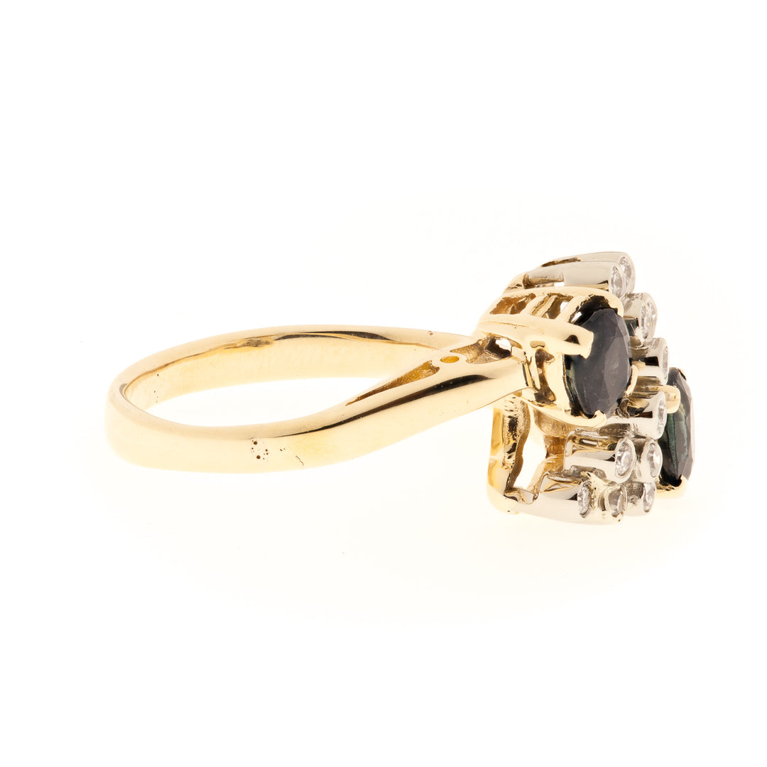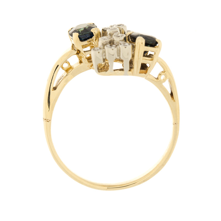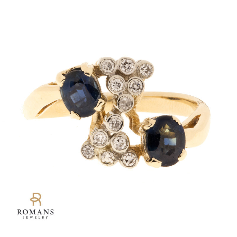 A unique zig-zag design ring with two oval sapphires stones nestles in the two corners, complemented by round diamonds in between. The 14K two tone gold setting holds them gracefully in simple, sophisticated style.