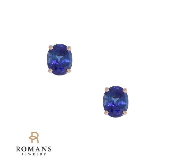 A beautifully matched pair of brilliant blue sapphires are secured in classic four-prong 14K rose gold basket settings with comfortable push back posts for pierced ears.
