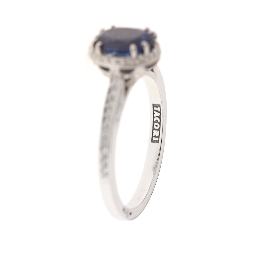 A halo of glimmering diamond accents encircles an oval-shaped sapphire center in this exquisite 18K white gold Tacori ring. Dazzling diamond accents adorn the band for a truly glamorous effect. Sapphire originates from Sri Lanka.