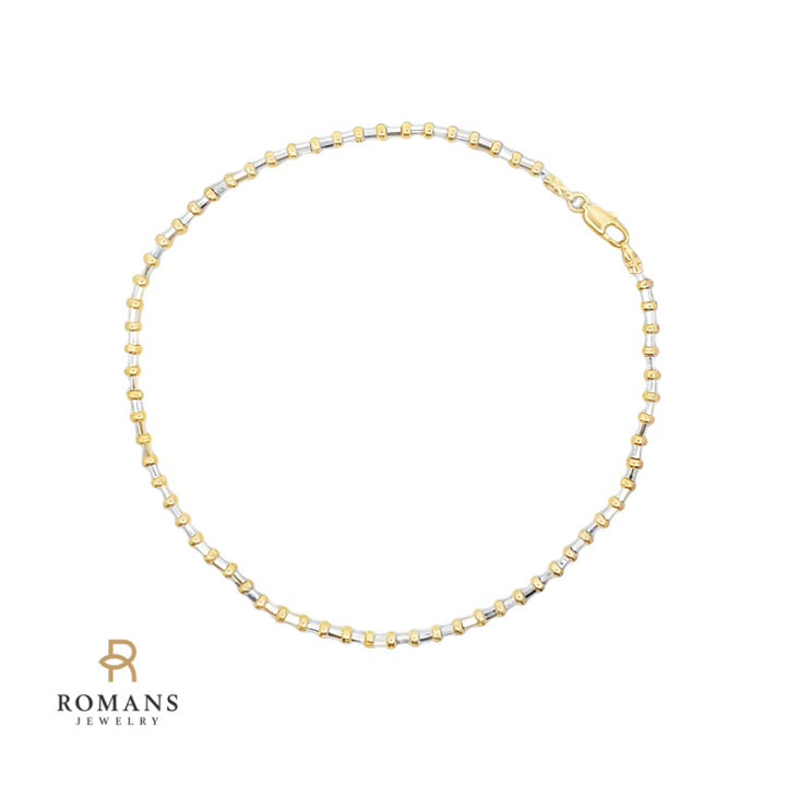 This elegant 14K two-tone gold bracelet features a unique bead-style design, combining the warmth of yellow gold with the sleek contrast of white gold. Measuring 9.25 inches in length and 2.6mm in width, it offers a refined and versatile look, perfect for layering or wearing as a standalone statement piece. Secured with a sturdy lobster clasp, this bracelet is both stylish and durable for everyday wear.