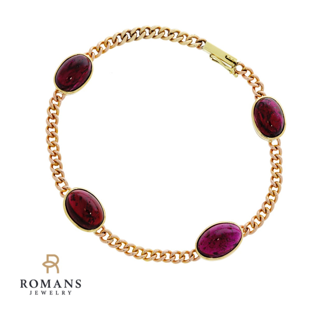 Brightly hued, this garnet bracelet is crafted in 14k yellow gold & rose gold. Four oval shaped garnets alternating with cable links connecting them adding to its vintage look. Garnet is the birthstone of January. There are slight surface inclusions.