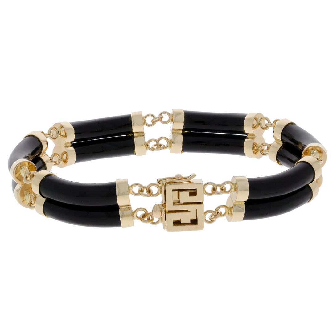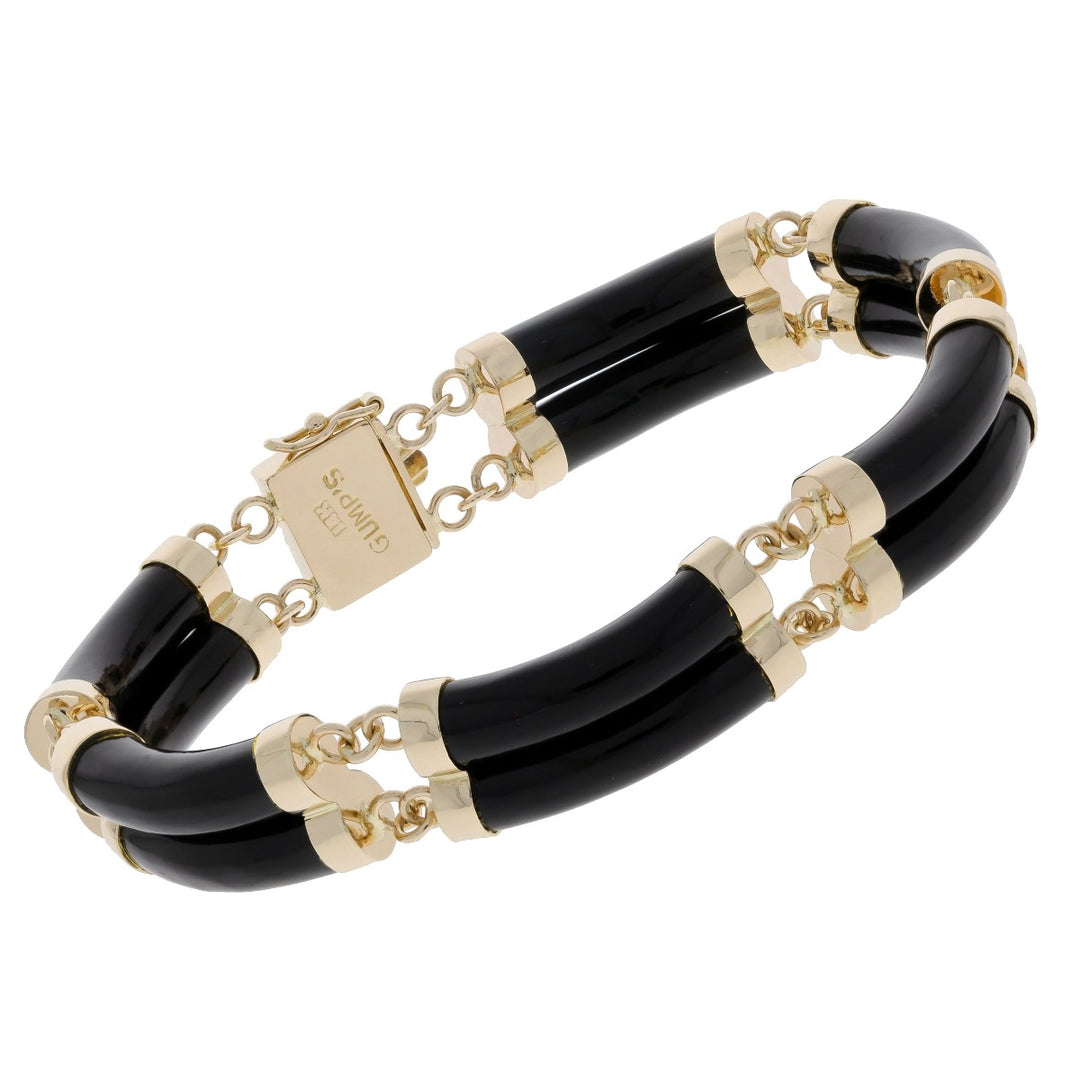 Stations of shining onyx curved bars held by glistening 14k yellow gold cups and rings enliven this versatile bracelet creating a playful design that adds understated texture to your look. This beautiful bracelet is appropriate for everyday wear for any occasion. Greek symbol on the clasp with a figure 8 clasp for extra security.