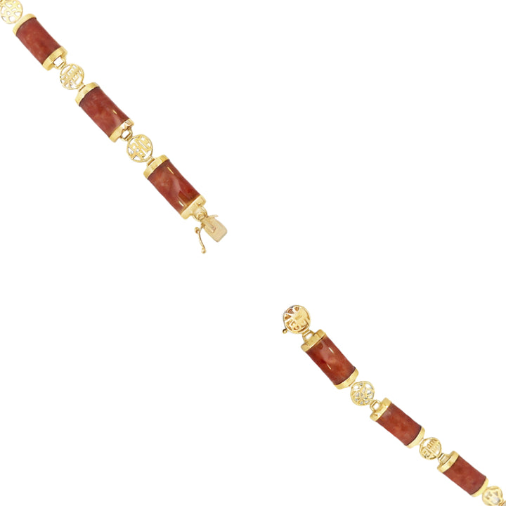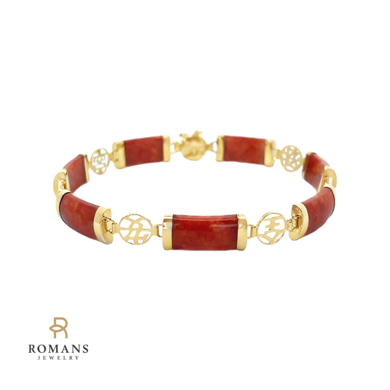 This elegant bracelet features vibrant red jade segments beautifully set in 14K yellow gold. Each segment is designed to create a smooth, eye-catching flow, while the gold band adds a sophisticated touch.