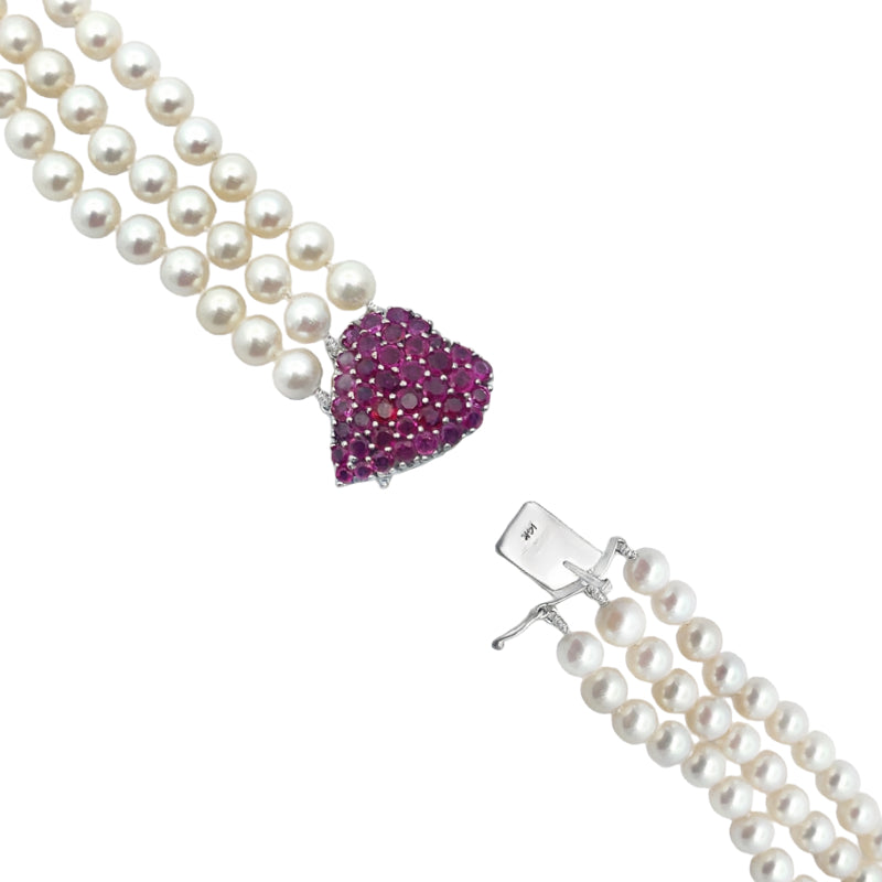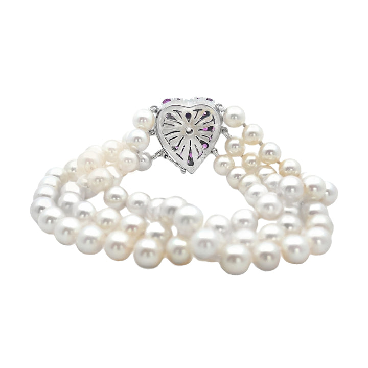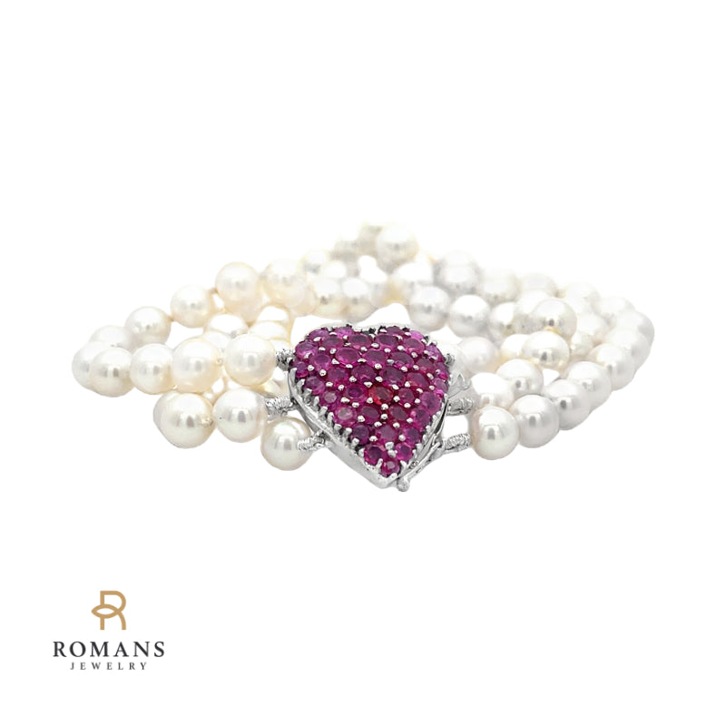 This elegant bracelet features three strands of pearls and of vibrant rubies, set in 14K white gold. The three-strand design adds texture, while the pearls and rubies create a beautiful contrast. It fits comfortably and is perfect for any occasion. The secure clasp ensures it stays in place.