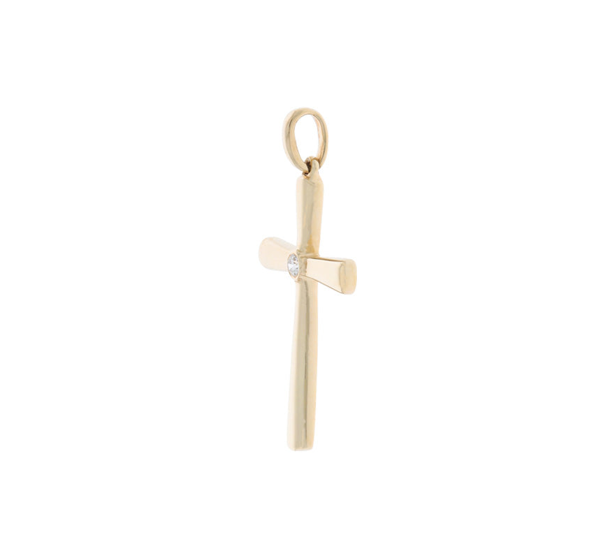 A meaningful symbol and a special pendant, this cross is crafted in warm 14k yellow gold with a diamond accent. This pendant makes a meaningful statement and a perfect gift. Diamond 0.02 carat total weight.