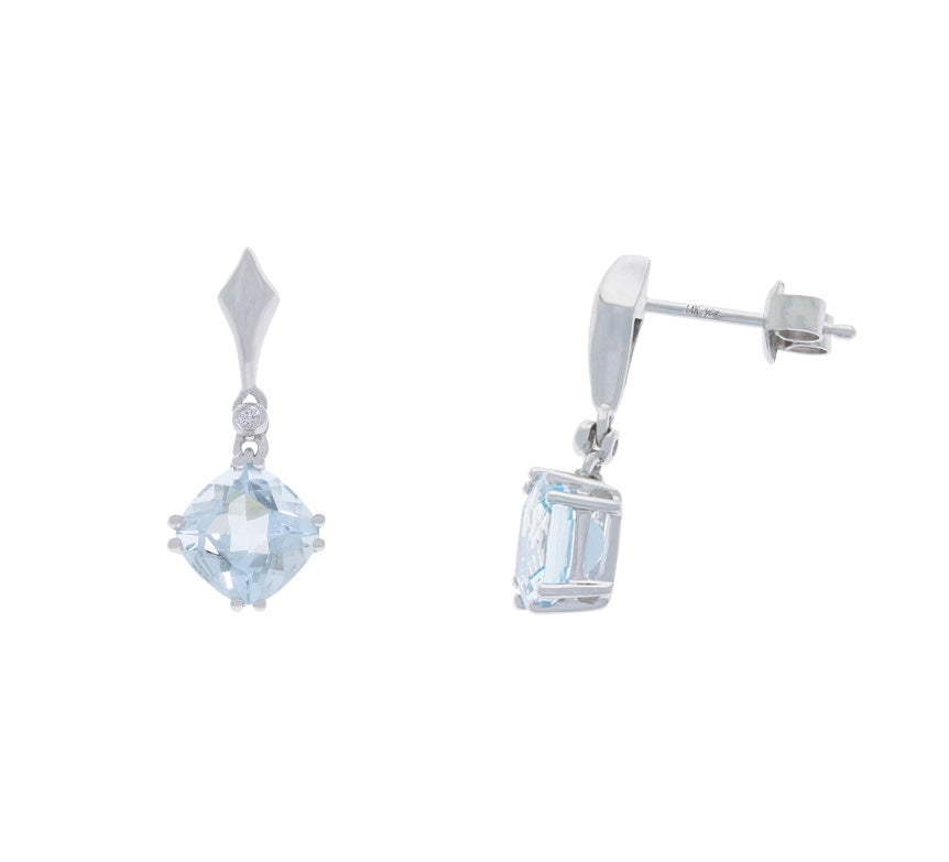 Fluid and elegant, these drop earrings feature beautiful cushion cut aquamarine gemstones framed with round brilliant diamonds in 14k white gold.