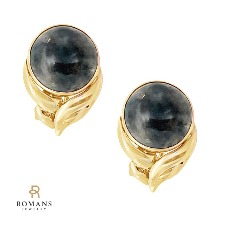 These round cabochon black jade 14k yellow gold earrings feature a sleek, nature-inspired design with a polished finish. The omega back ensures secure and comfortable wear, making them a perfect accessory for both professional and casual settings. Their elegant simplicity and rich black hue add a touch of sophistication to any outfit. ( Jade Size 12mm)