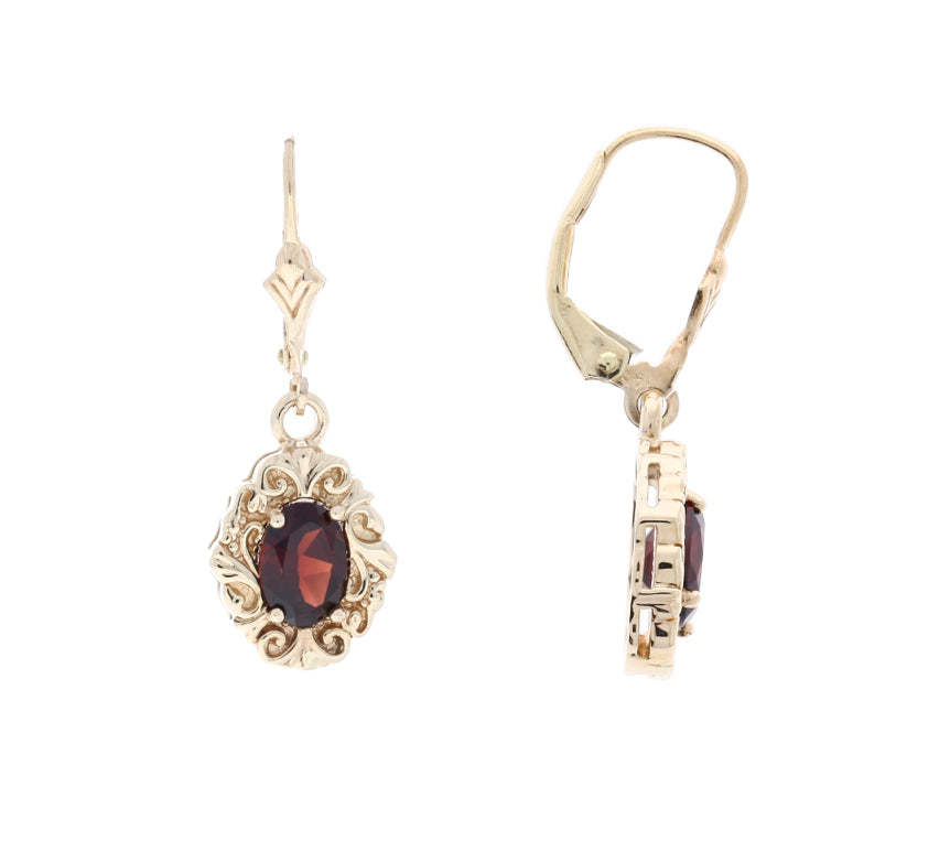 Each of these stunning earrings features a brilliant oval garnet center complemented by majestic filigree engravings that add to the regal look of this piece. Comfortable lever backs secure the earrings in place for pierced ears.