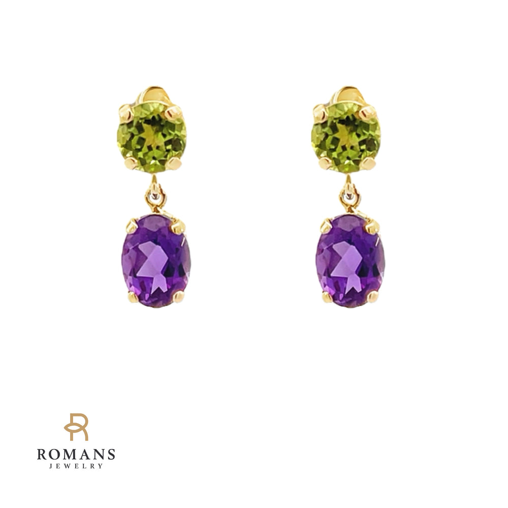 These vibrant dangle earrings feature a sparkling round cut peridot and an elegant oval cut amethyst, set in warm 14K yellow gold. The combination of the bright green peridot and the rich purple amethyst creates a striking contrast, adding a pop of color to any look. Perfect for both casual and formal occasions, these earrings bring a touch of elegance and charm. Peridot 1.16 carat total weight, Amethyst 1.24 carat total weight.