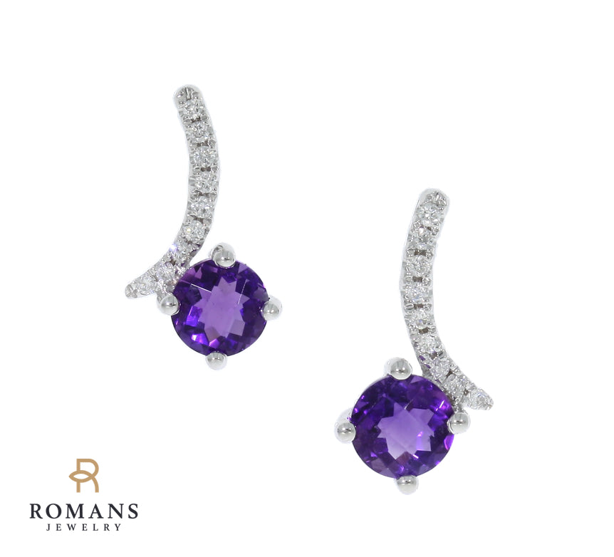 Show off purple brilliance with these bold round-cut checkerboard amethyst gemstones set in 14k white gold drop-style earrings. The gems hang from a curved bar with dazzling round-cut diamonds revealing lustrous sparkle you'll love to wear.