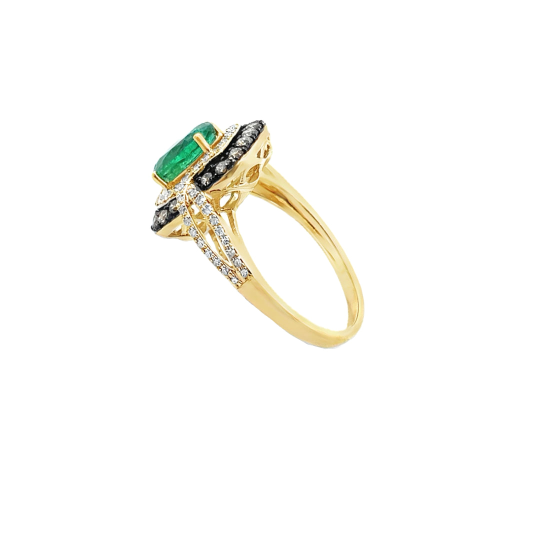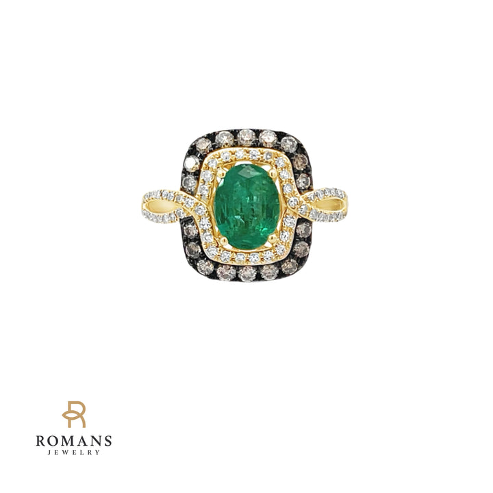 This exquisite ring features a striking oval-cut emerald, surrounded by a tangled halo of brilliant diamonds, creating a captivating contrast of color and sparkle. Set in warm 14K yellow gold, the rich green of the emerald is beautifully complemented by the dazzling white and champagne diamonds, offering a perfect balance of elegance and sophistication. The unique design of the tangled halo adds a modern twist to a classic gemstone, making this piece a standout addition to any fine jewelry collection.