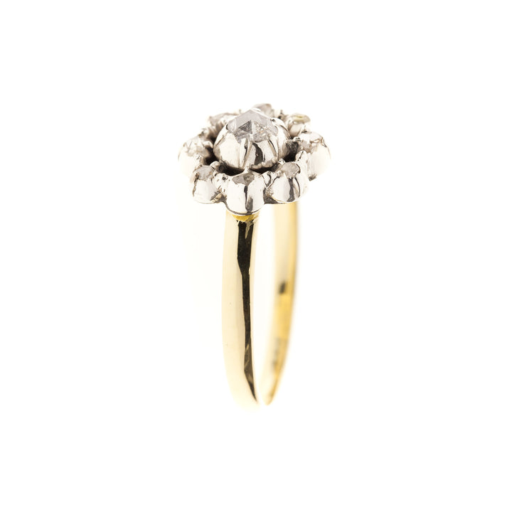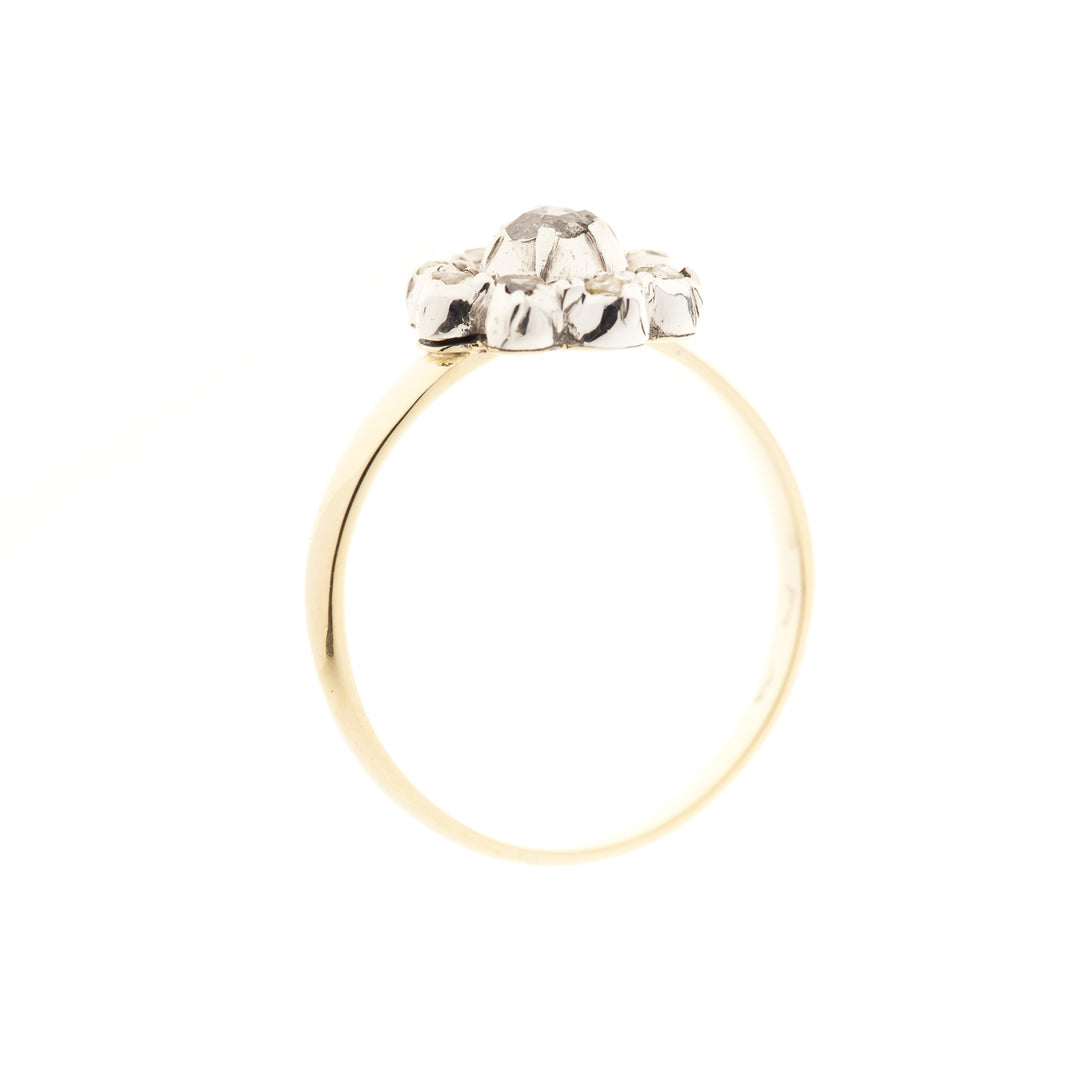 This 1880's 14k yellow gold and sterling silver rose cut diamond ring. Center rose cut diamond with a flower halo with small rose cut diamonds.