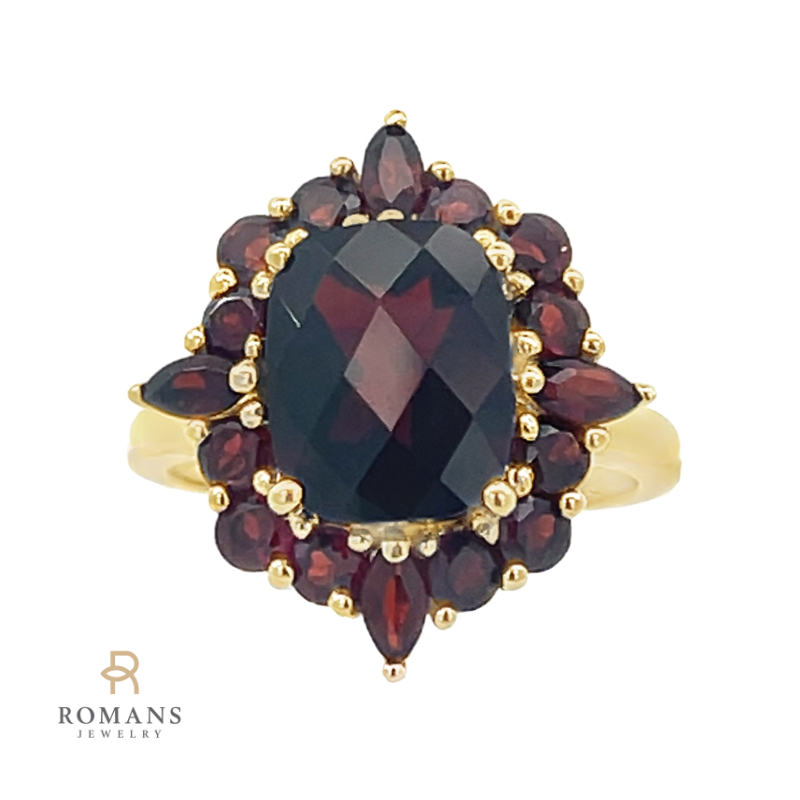 This elegant ring features a 3.24ct cushion checkerboard-cut garnet at the center, surrounded by a 1.12ctw halo of marquise and round-cut garnets for added brilliance. Crafted in 14K Yellow Gold, this vintage-inspired design is both timeless and sophisticated.