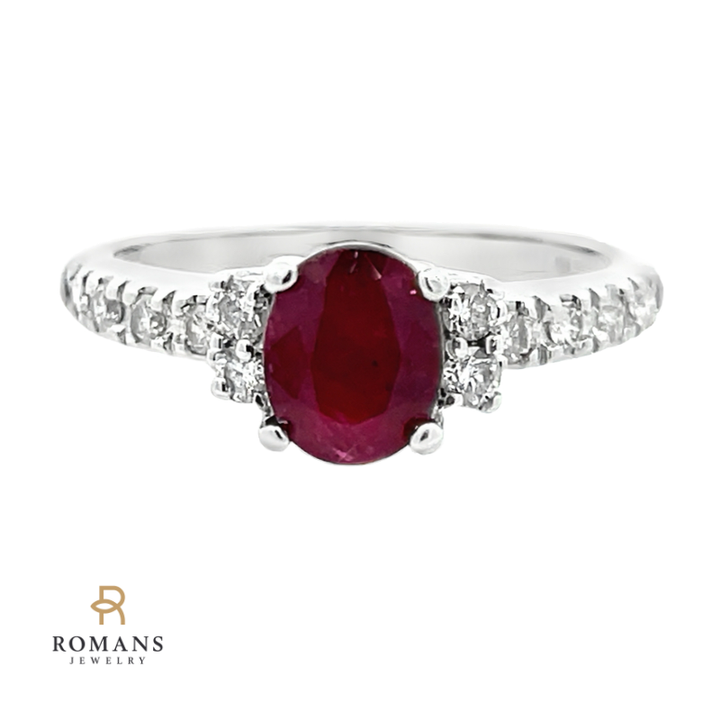 Make a statement of timeless elegance with this exquisite oval ruby and diamond ring. The rich, deep red ruby is beautifully set in a gleaming 14K white gold band, accented by sparkling side diamonds that enhance its brilliance. Perfect for engagements, anniversaries, or as a luxurious gift, this ring embodies sophistication and romance in every detail.