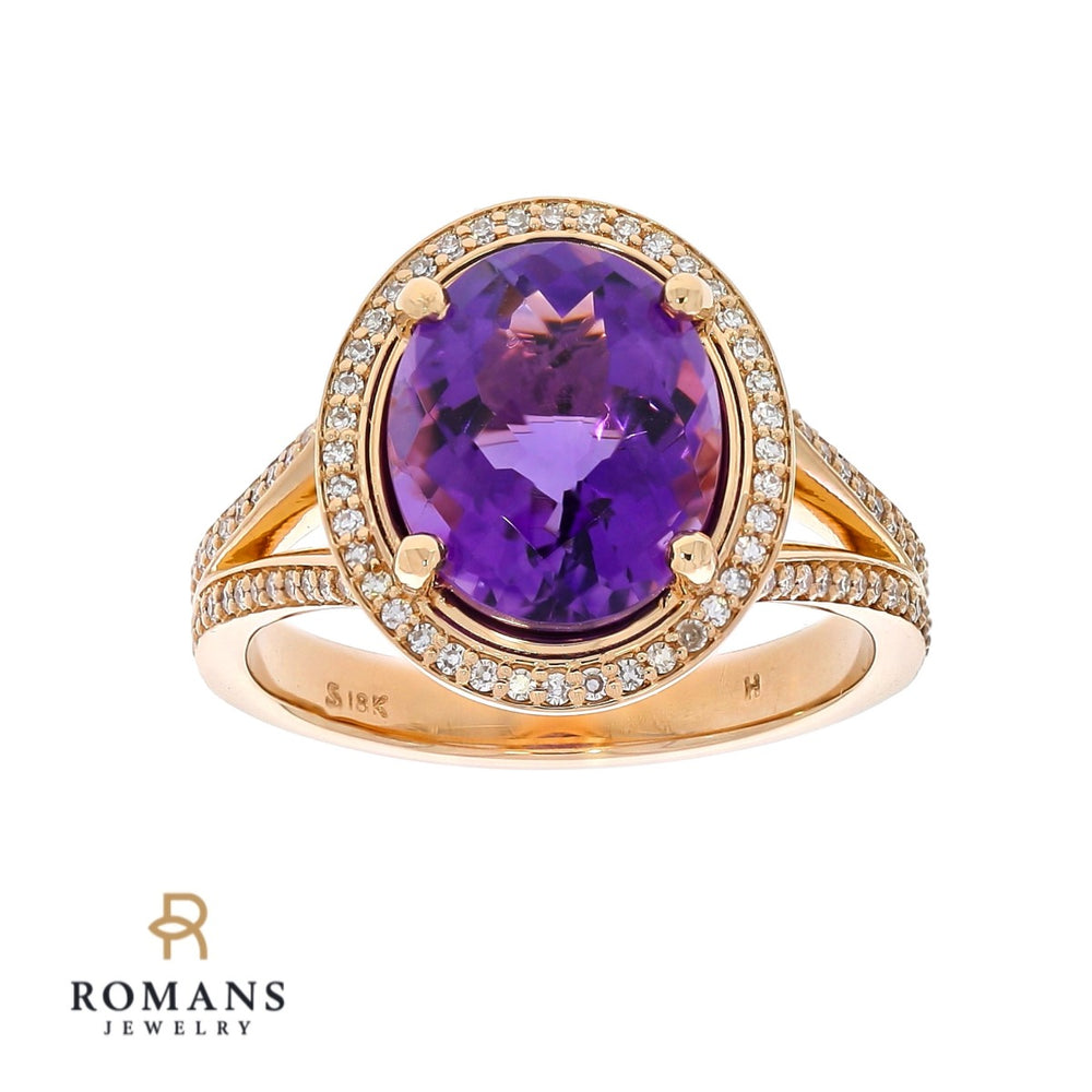 This exceptional 14k rose gold setting features a halo of diamond accents that curve gently around a stunning oval-shaped amethyst for a distinctive look. Two rows of pavé diamonds sparkle on the contemporary split shank band completes this glamorous look.