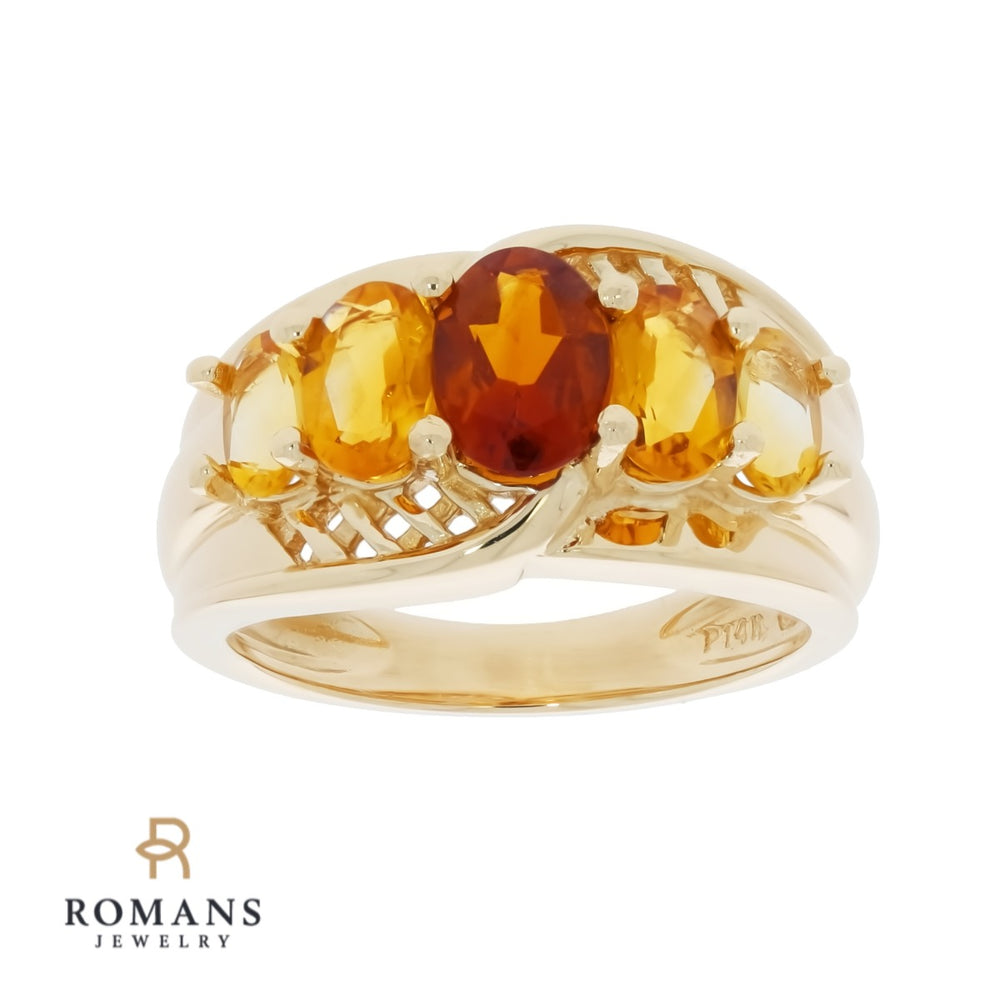 A breathtaking oval citrine stone nestles at the center of this luxurious ring, complemented by 2 oval lighter citrines on either side. The 14K yellow gold setting holds them gracefully in simple, sophisticated style.