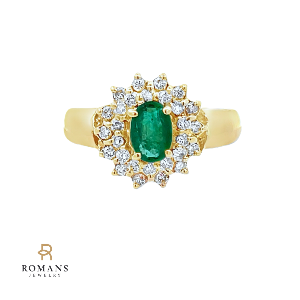 A breathtaking oval emerald stone nestles at the center of this luxurious ring, complemented by 3 rows of diamonds surrounding the emerald. The 14K yellow gold setting holds them gracefully in simple, sophisticated style. Emerald .30 carat weight. Diamonds .14 carat weight I1 clarity and IJK color. Current ring size 4.5.
