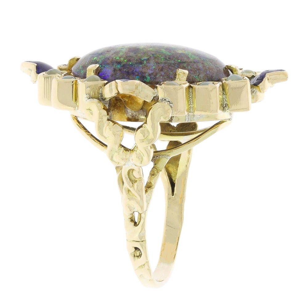 This estate 14K yellow gold ring features an oval-shaped sugar black opal cabochon in a compass point setting. Royal blue enamel adorn the north and south corners of the top and cat's eye accents add to the beauty of this piece. Filigree adorns the shoulders and shank.  This ring does show minor signs of age with a minor abrasion on the edge of the opal and enamel showing some minor chips.