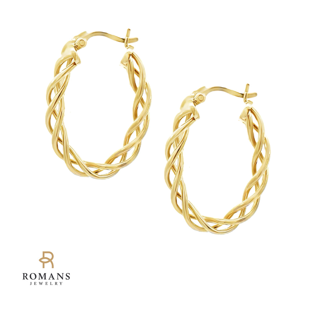 These 14k yellow gold oval hoop earrings feature three twisted wires, creating a chic braided design. Timeless and elegant, they add a touch of sophistication to any look.