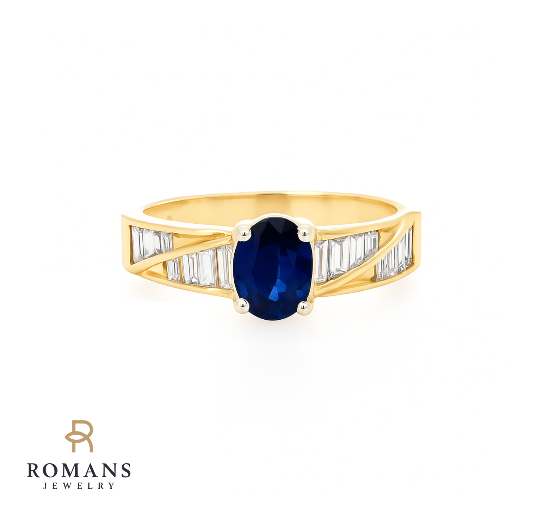 A breathtaking oval blue sapphire stone nestles at the center of this luxurious ring, complemented by 4 baguette diamonds on either side. The 18K yellow gold setting holds them gracefully in simple, sophisticated style.