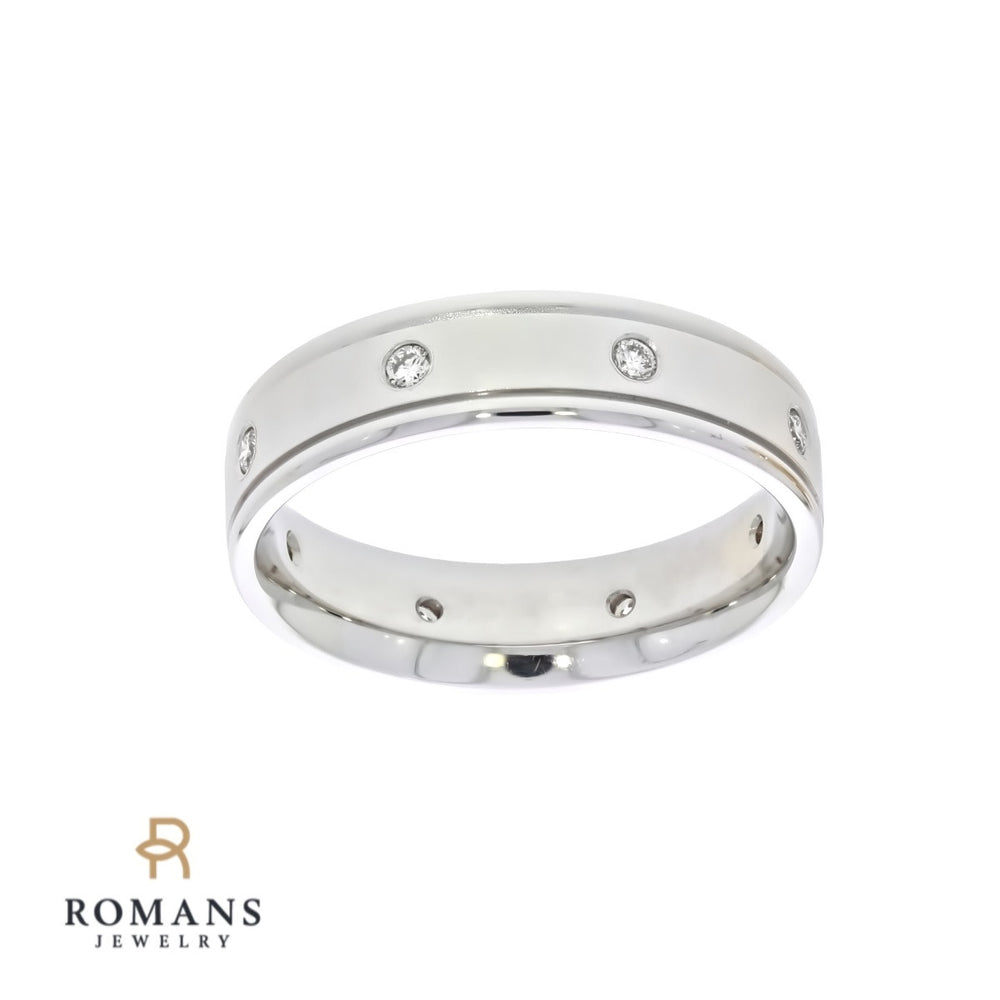 An attractive band with contemporary detail, this distinctive ring features eight sparkling round brilliant cut diamonds that are flush set in a soft matte finish and balanced with two polished beveled edges. The interior has a rounded inside edge for increased comfort.