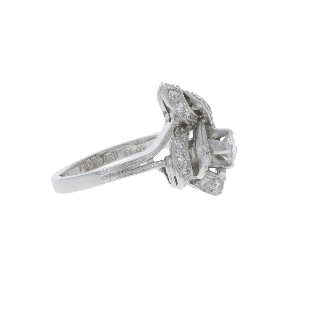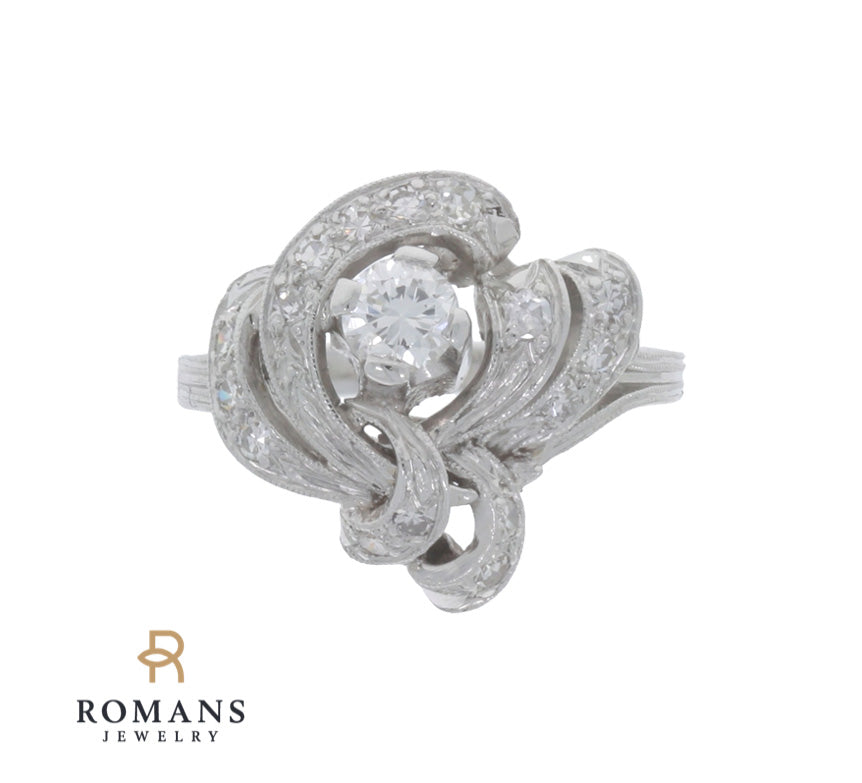 In this glamorous and whimsical vintage ring, fluid curves of prong set round single diamonds and warm platinum ribbon encircle a four-prong basket that beautifully showcases the center diamond creating a breathtaking shimmer look.