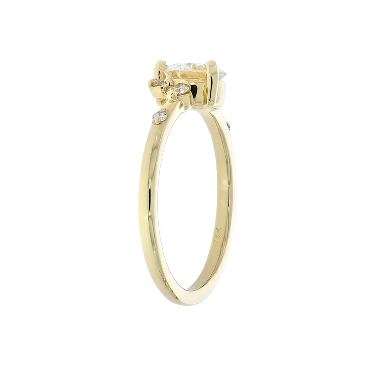 An gorgeous 14k yellow gold engagement ring is adorned with prong-set diamonds spaced elegantly with two diamonds at the side of the main center diamond for a sophisticated and alluring look.