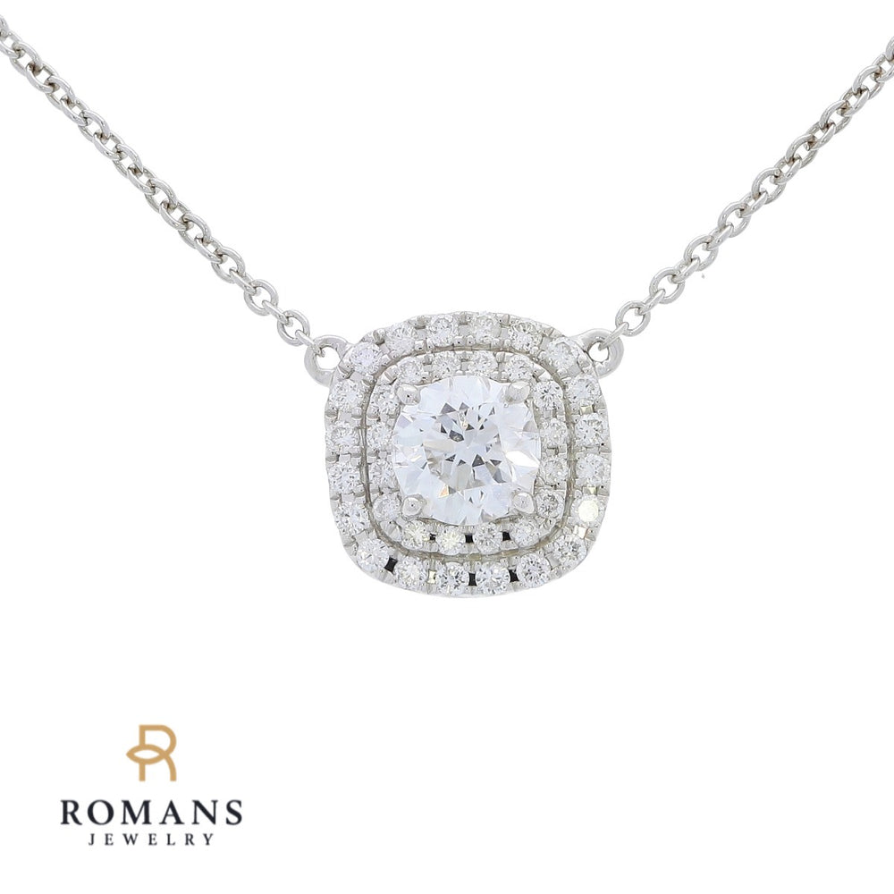 Elegant and graceful, this cushion shaped diamond pendant showcases a double halo of sparkling micropavé diamonds framing the round center diamond fixed along a diamond by the yard cable chain.