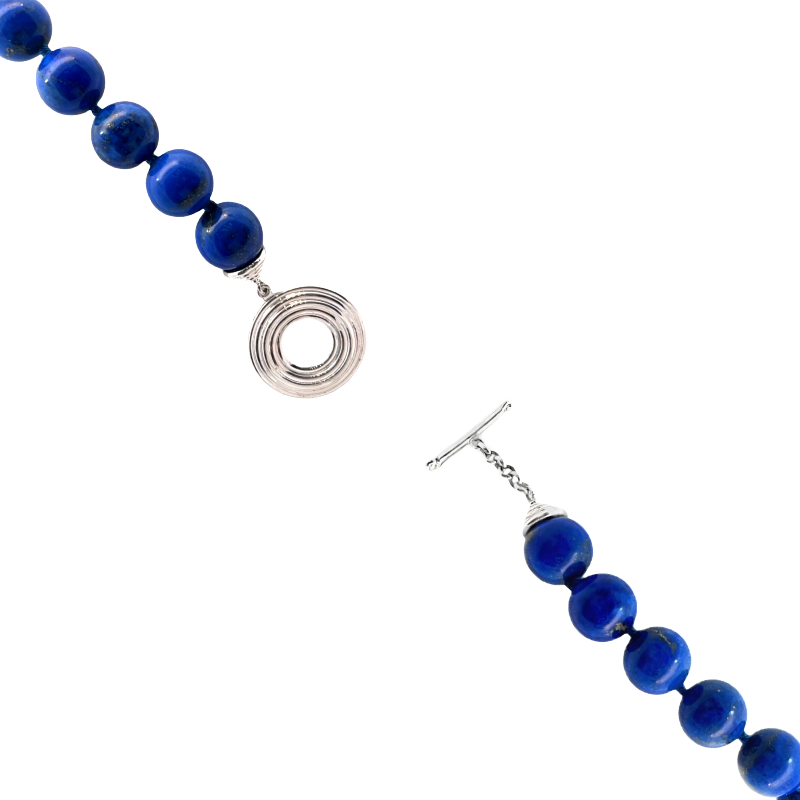 The beauty and richness of natural lapis lazuli, a stone used since ancient royalty. This lapis necklace is composed of knotted natural polished beads. Finished with a silver clasp.