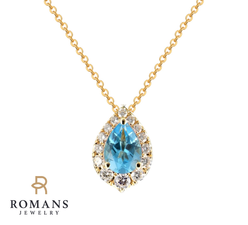Blue Topaz Halo Diamond Pendant 14K Yellow Gold