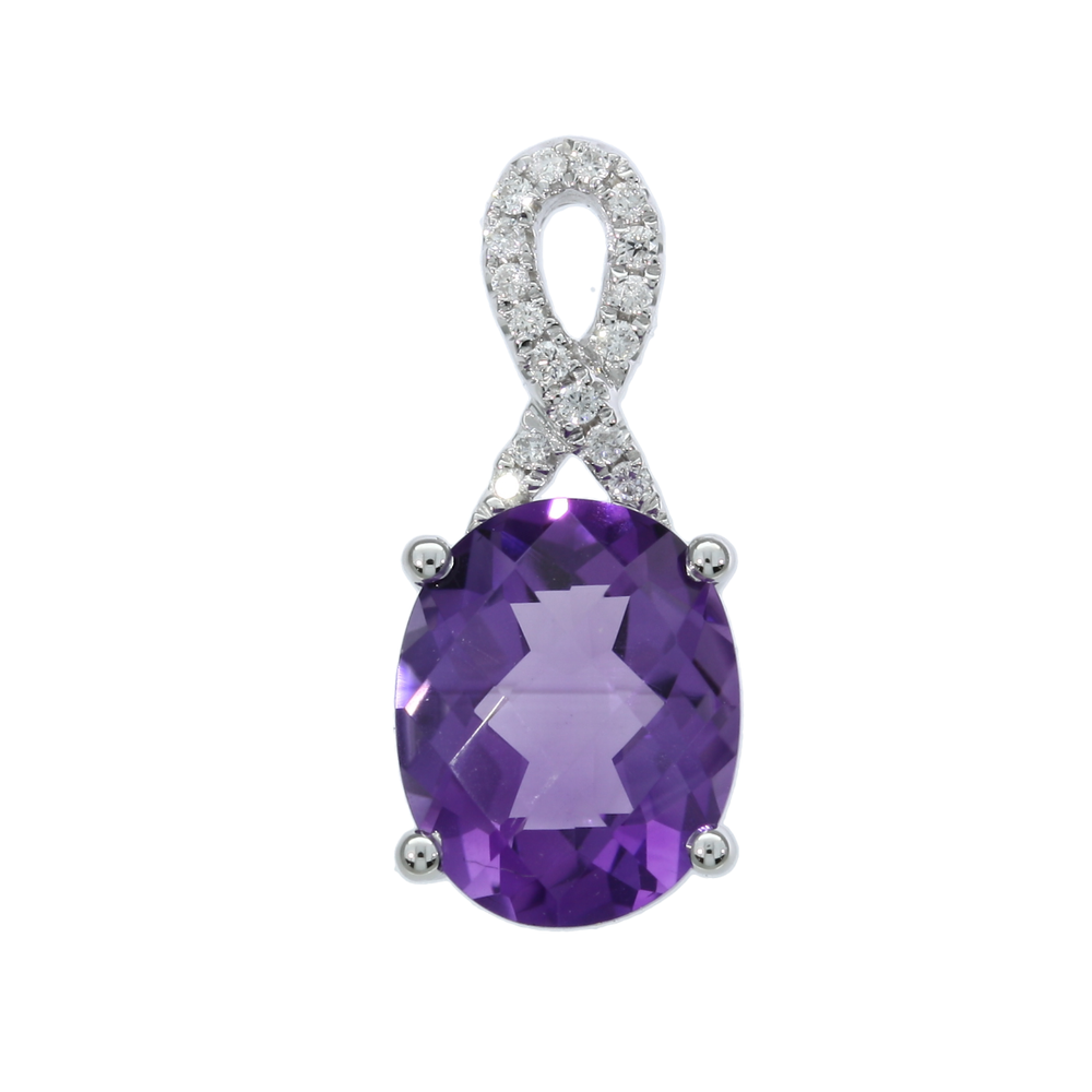 Elegant in every way this amethyst and diamond pendant features a single oval checkerboard amethyst set in a 4-prong setting with a twisted ribbon diamond studded bail adding a beautiful sparkle to this everyday piece. CHAIN SOLD SEPARATELY