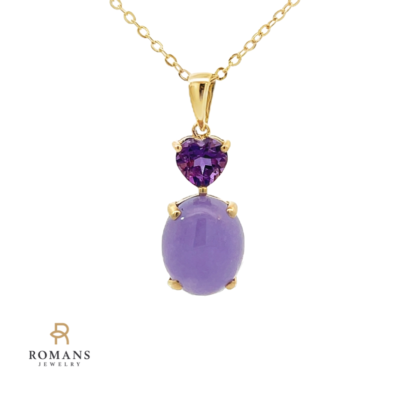 This lavender jade and amethyst pendant is an excellent choice. Crafted in bright 14k yellow gold, this gemstone pendant features an oval lavender jade with a heart cut amethyst above it. The petite size makes this a great everyday jewelry option. Amethyst 0.67 carat weight. CHAIN SOLD SEPARATELY